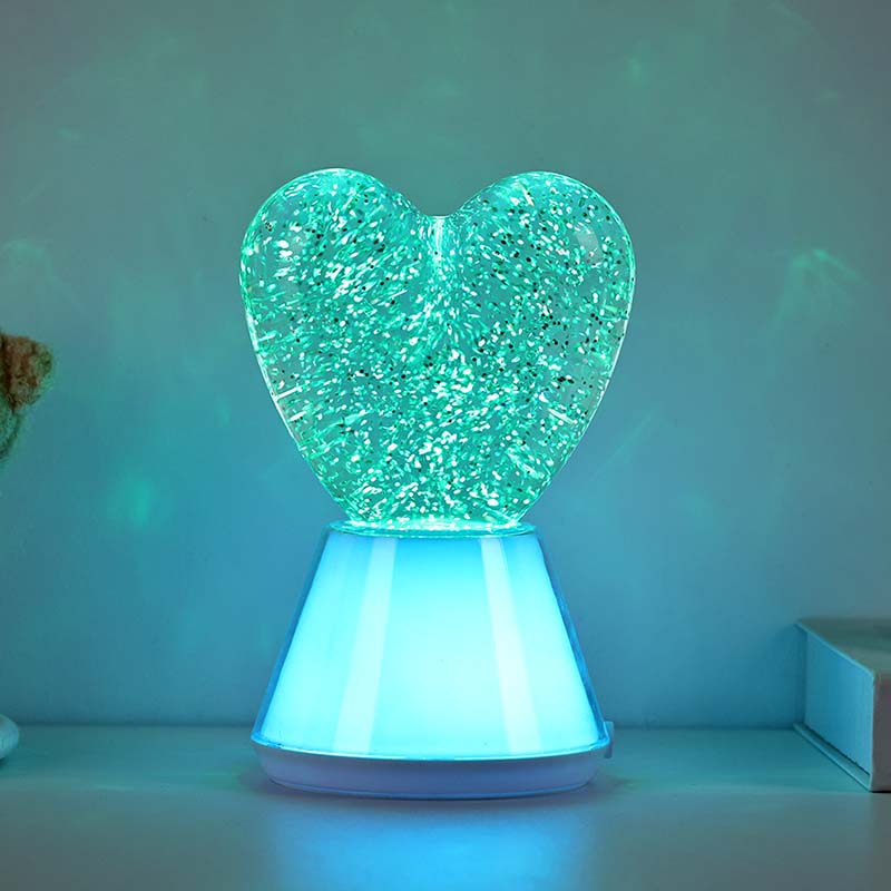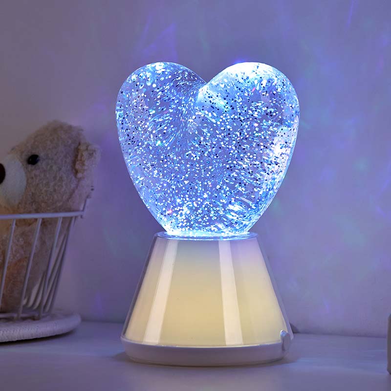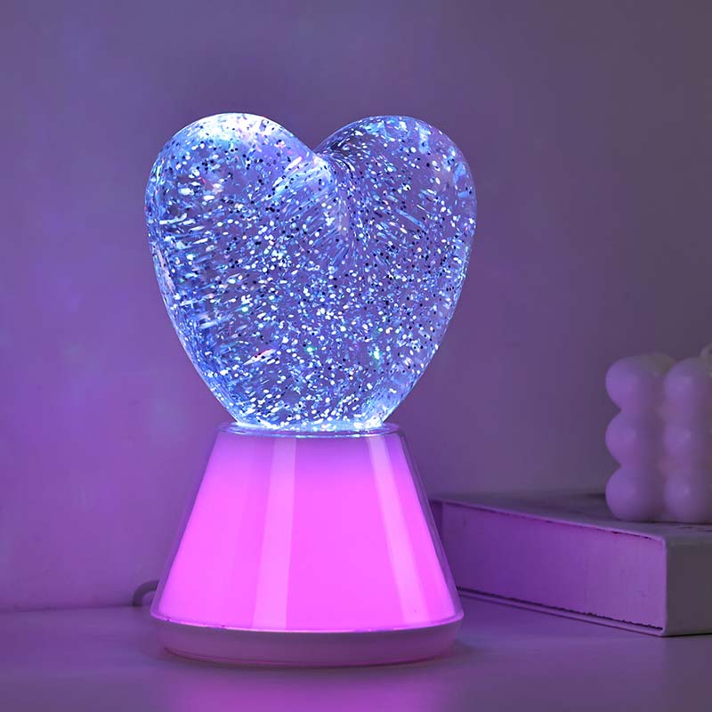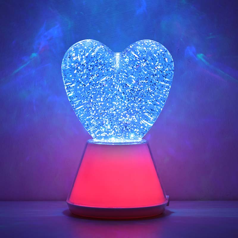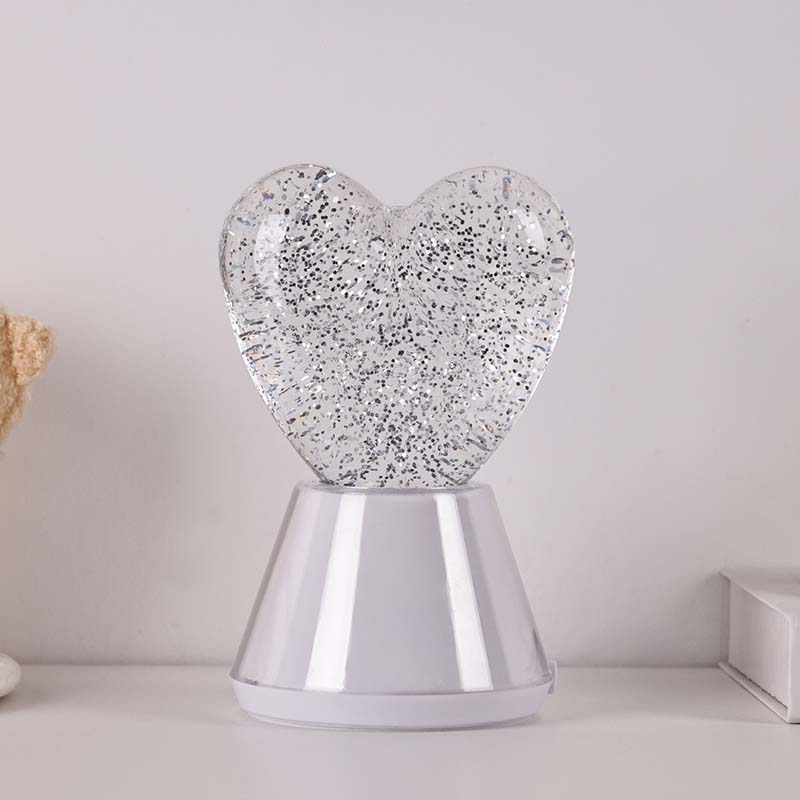 Zmieniająca kolor lampka nocna z płynnym brokatem i kloszem w kształcie serca. zawiera wykwintną szklaną kulę wypełnioną tajemniczym płynem, w którym unoszą się połyskujące cekiny. W cudowny sposób zmieniająca kolor lampka nocna z płynnym brokatem i kloszem w kształcie serca jak gdyby tańczyła w magicznym świecie.