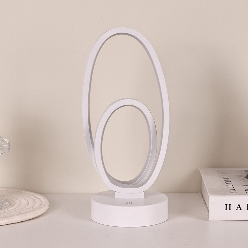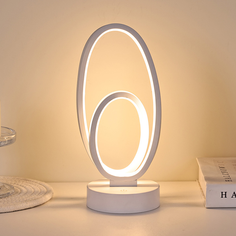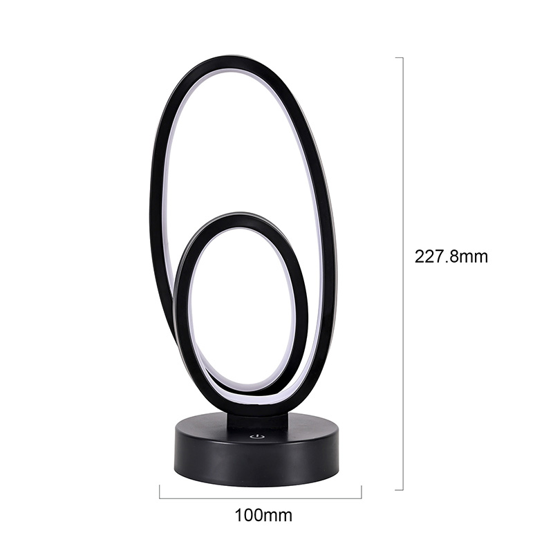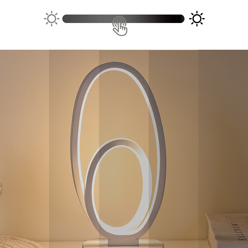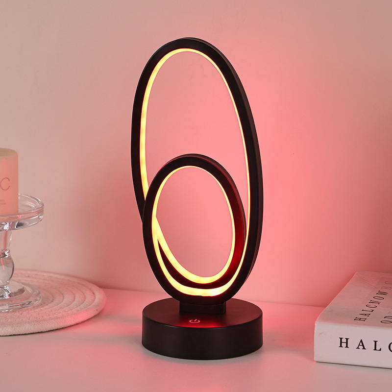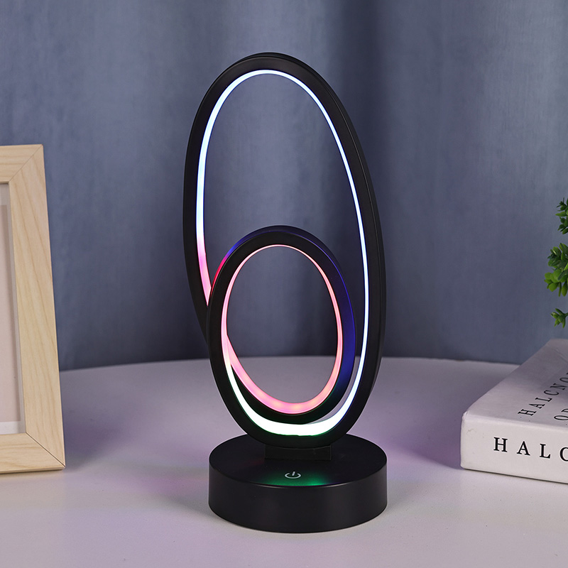 44*33*wys. 23,5 cmLampa biurkowa RGB z podwójnym okrągłym kloszem ma konstrukcję z podwójnym pierścieniem i eleganckimi konturami zarysowanymi minimalistycznymi liniami. Łącząc metal i wysokiej jakości tworzywo sztuczne, charakteryzuje się wyjątkową fakturą i delikatnym dotykiem. To nie tylko narzędzie oświetleniowe