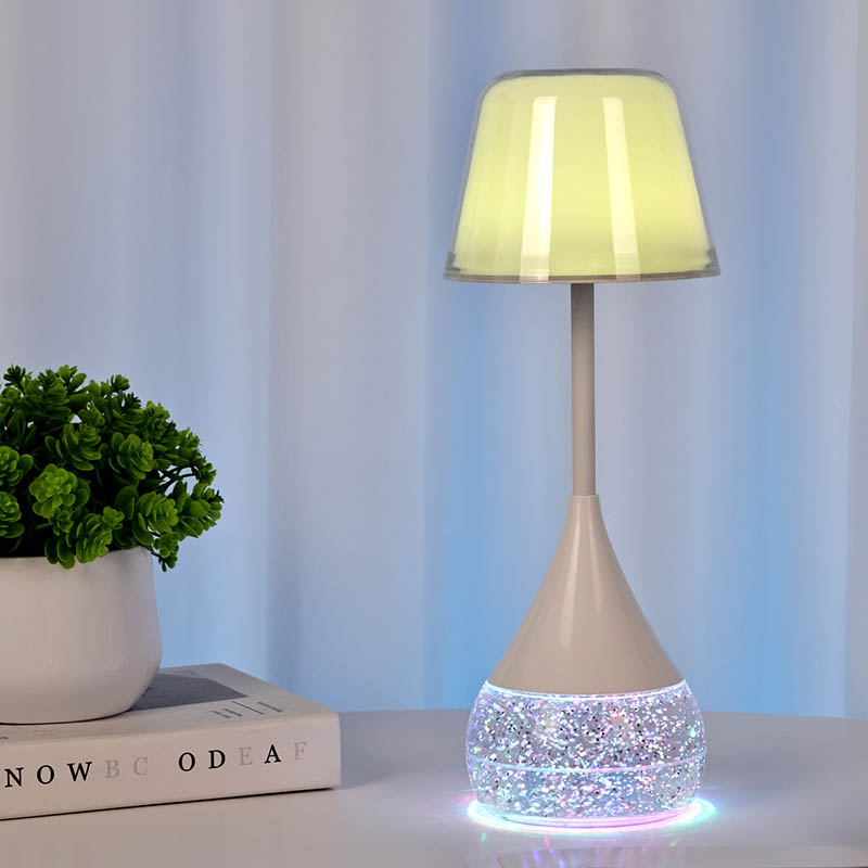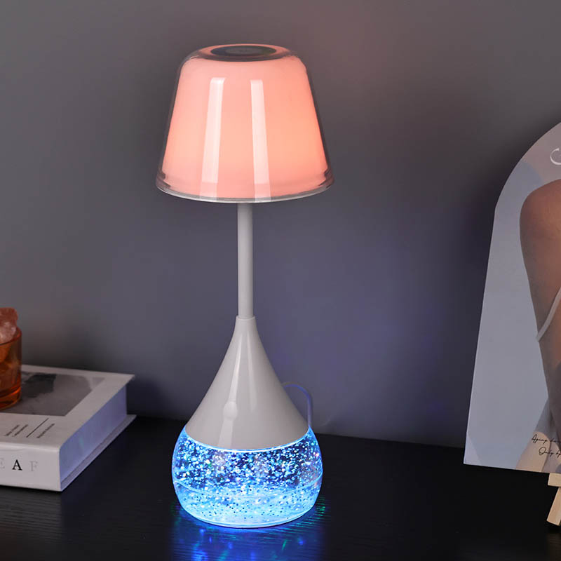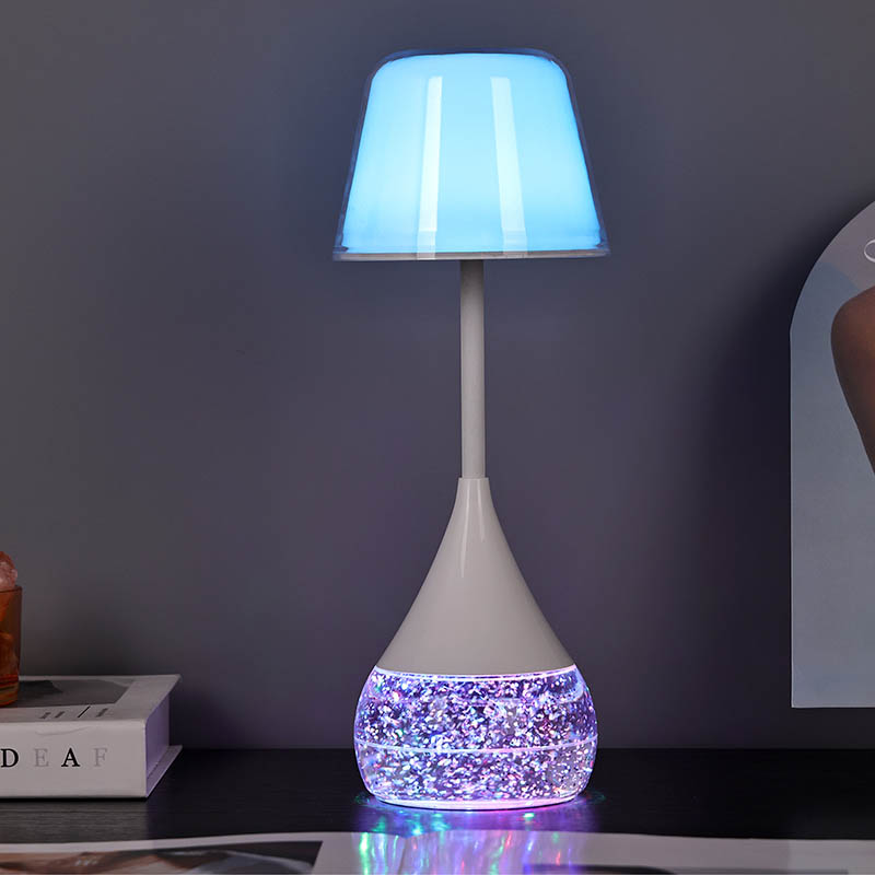 Elegancja i innowacja LED LED biurka z górną częścią bazy RGB jest ozdobiona okrągłym białym abażurem, który równomiernie rozprasza światło, tworząc miękką i przyjemną atmosferę. Poniżej pasek kolorowych świateł LED owija się wokół podstawy, dodając do projektu dynamiczny i przyciągający wzrok element. Sama podstawa przypomina kryształową kulkę, osadzoną w kolorowych szklanych odłamkach, które odbijają się i załamują światło w hipnotyzujący sposób.