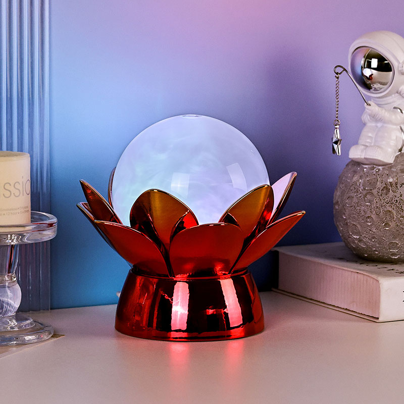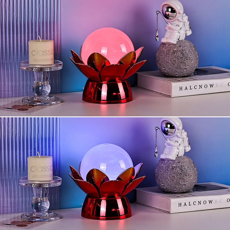 Czarująca lampka nocna Lotus Cloud Globe – hipnotyzujące połączenie designu inspirowanego naturą, kojącej atmosfery i nowoczesnej technologii. Ta elegancka lampa dekoracyjna ma półprzezroczystą szklaną kulę wypełnioną specjalnym płynem, który symuluje dryfujące chmury, tworząc spokojny, eteryczny efekt, gdy delikatnie wiruje i płynie. Zainspirowana świętym kwiatem lotosu, ta lampka nocna spoczywa na pięknie wykonanej metalowej podstawie w kształcie kwitnących płatków lotosu, symbolizującej czystość, pokój i duchowe przebudzenie.