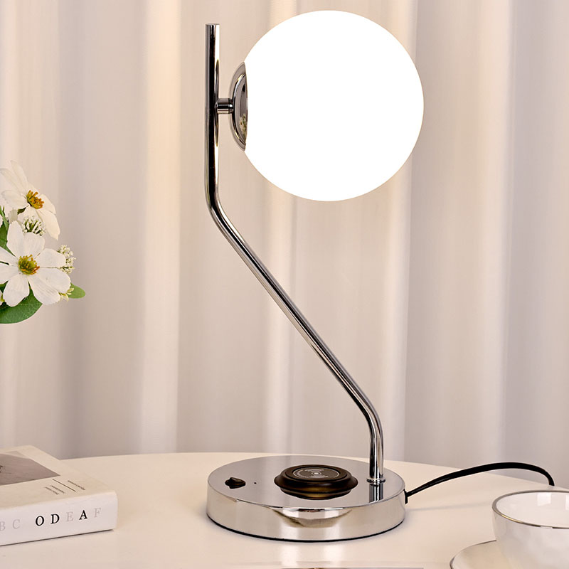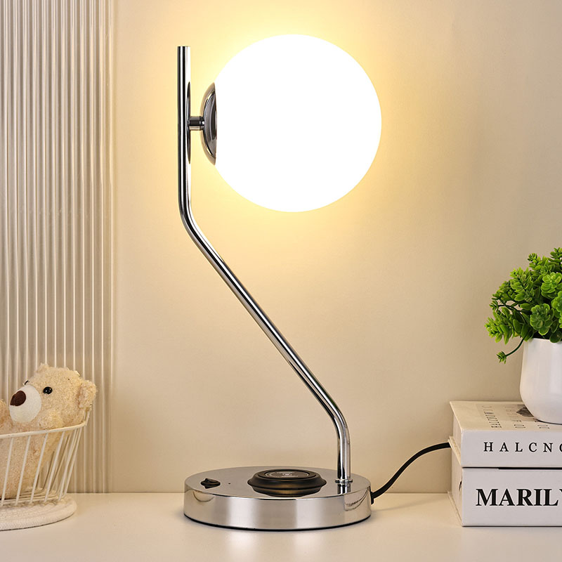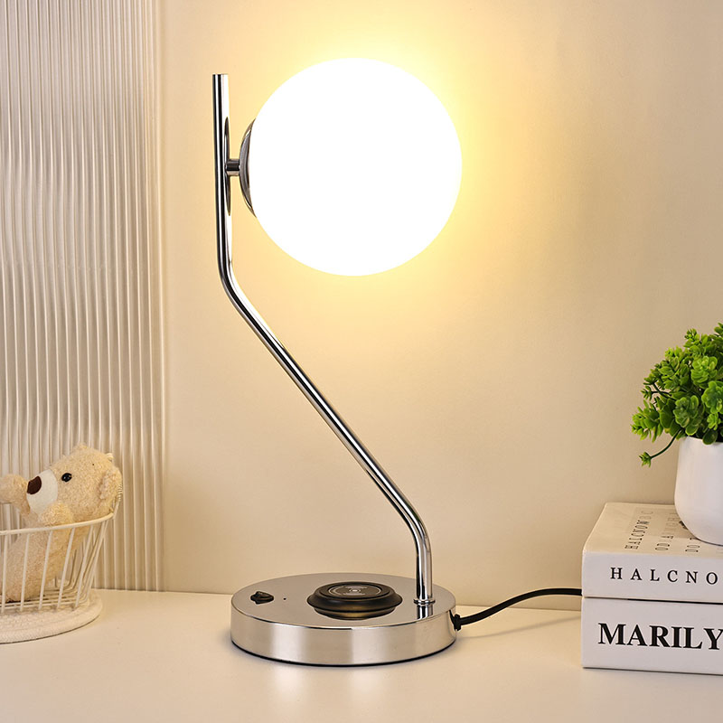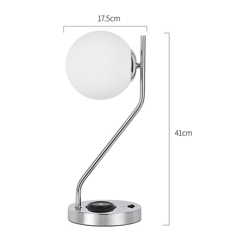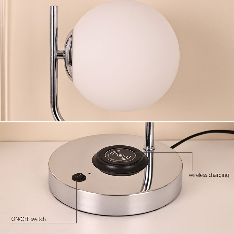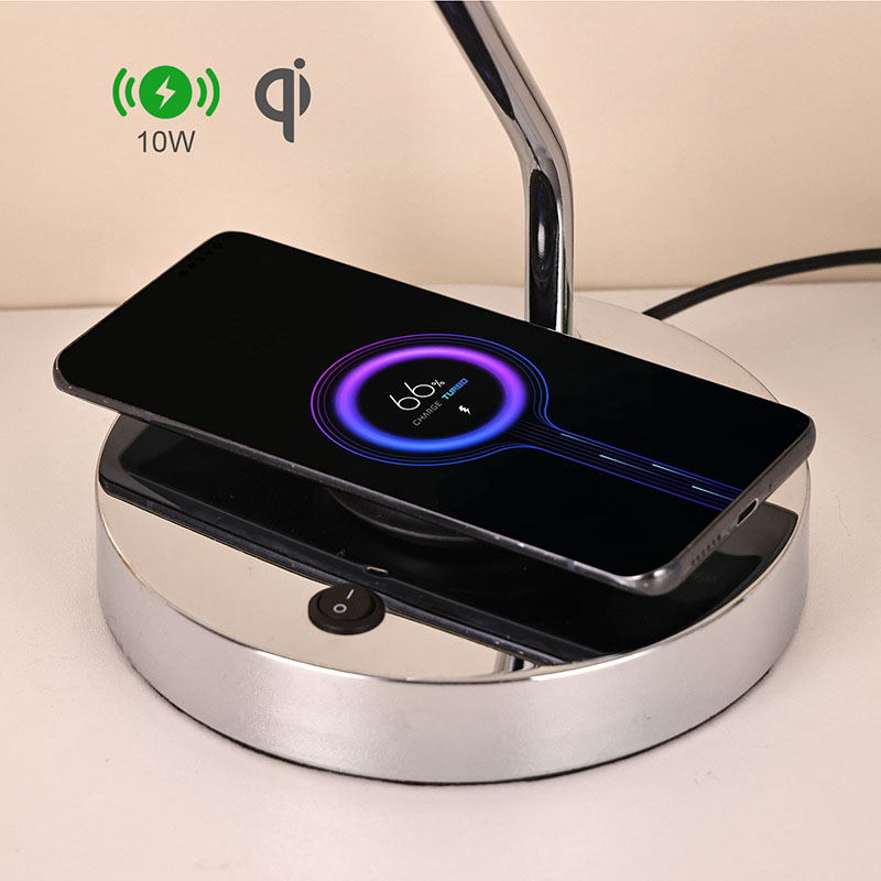 Lampka biurkowa ze szklanym kloszem i bezprzewodową ładowarką wyposażona jest także w metalową, bezprzewodową bazę do ładowania telefonu komórkowego. Po prostu delikatnie umieść telefon z funkcją ładowania bezprzewodowego na podstawie, aby rozpocząć szybkie ładowanie, bez konieczności wykonywania żmudnych czynności