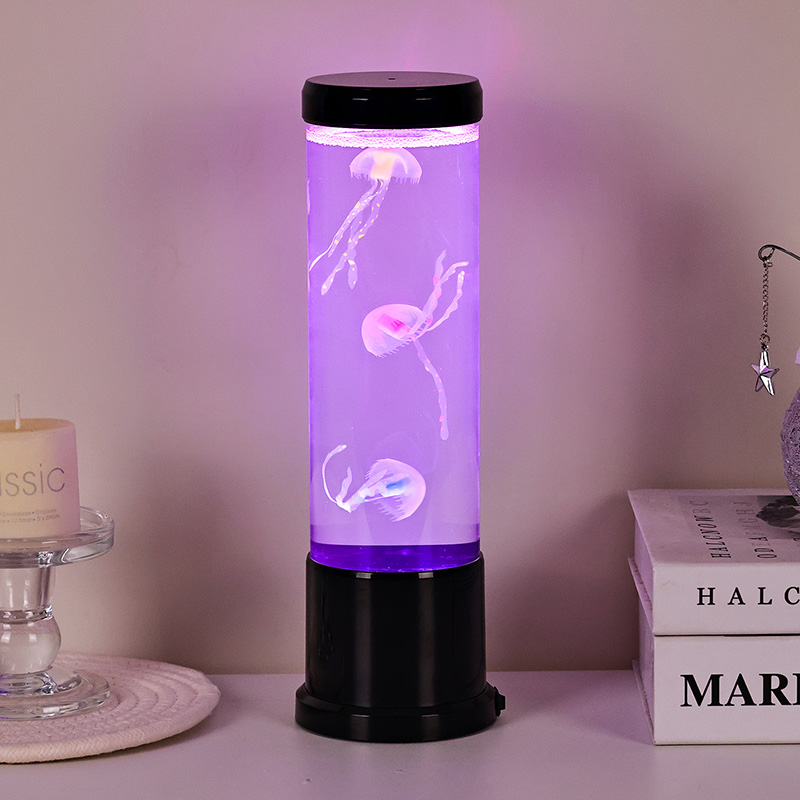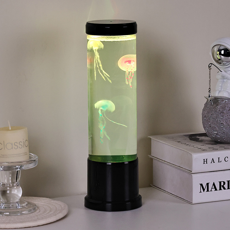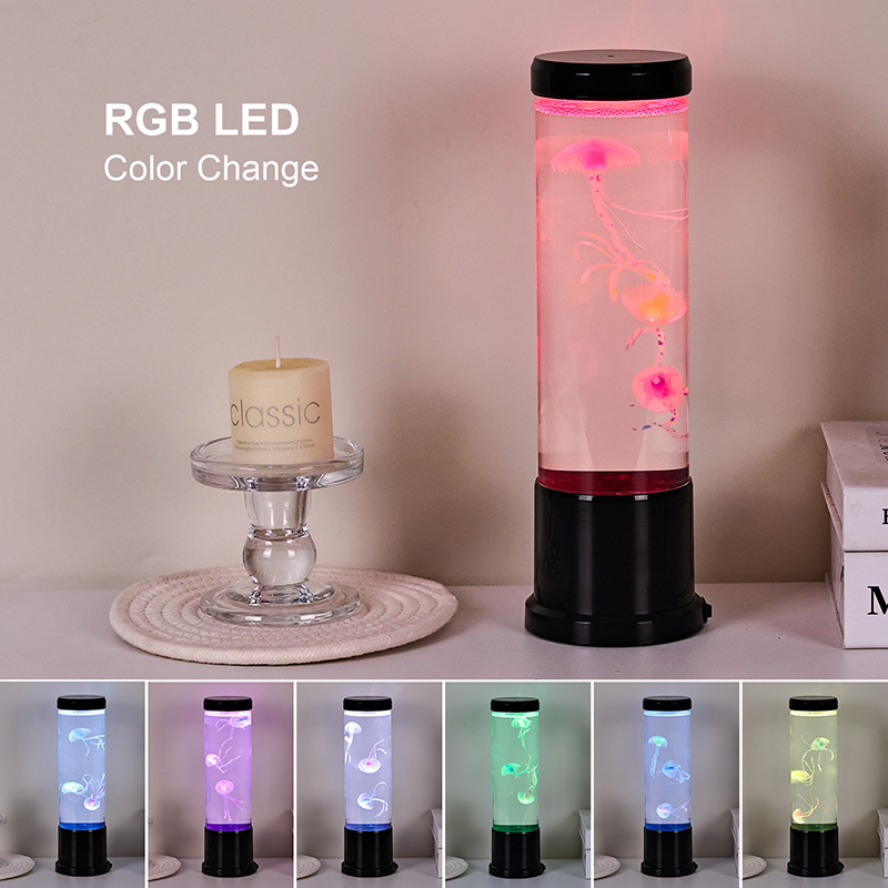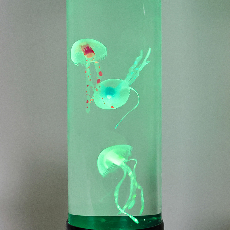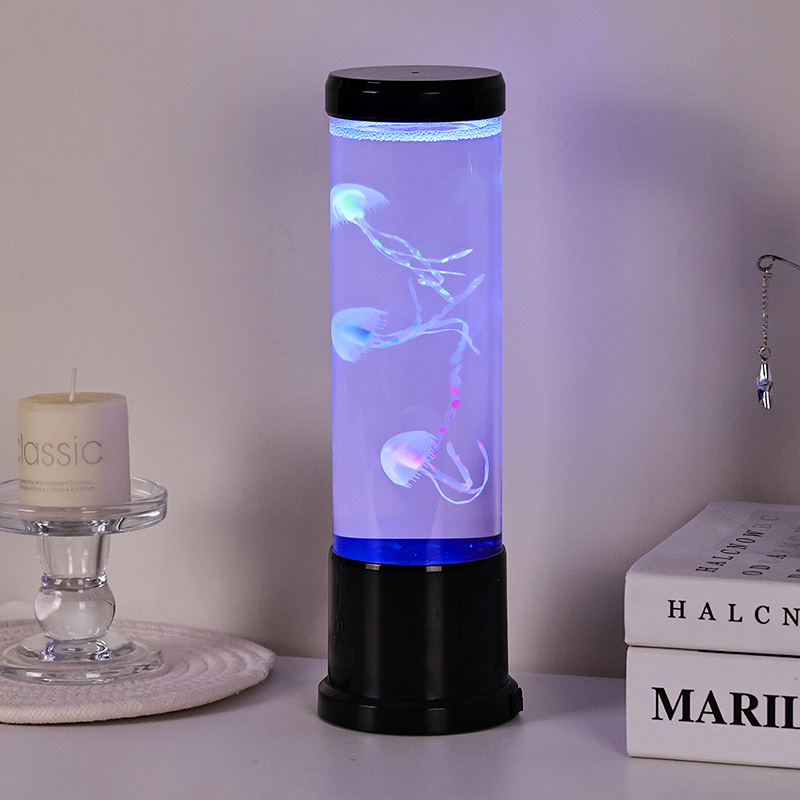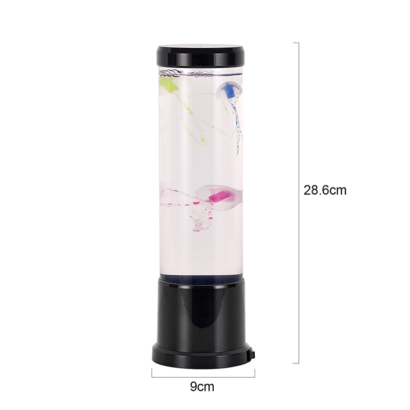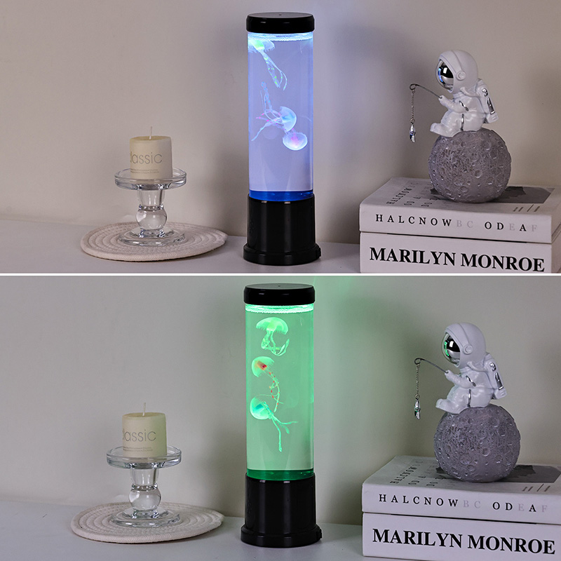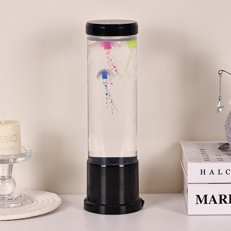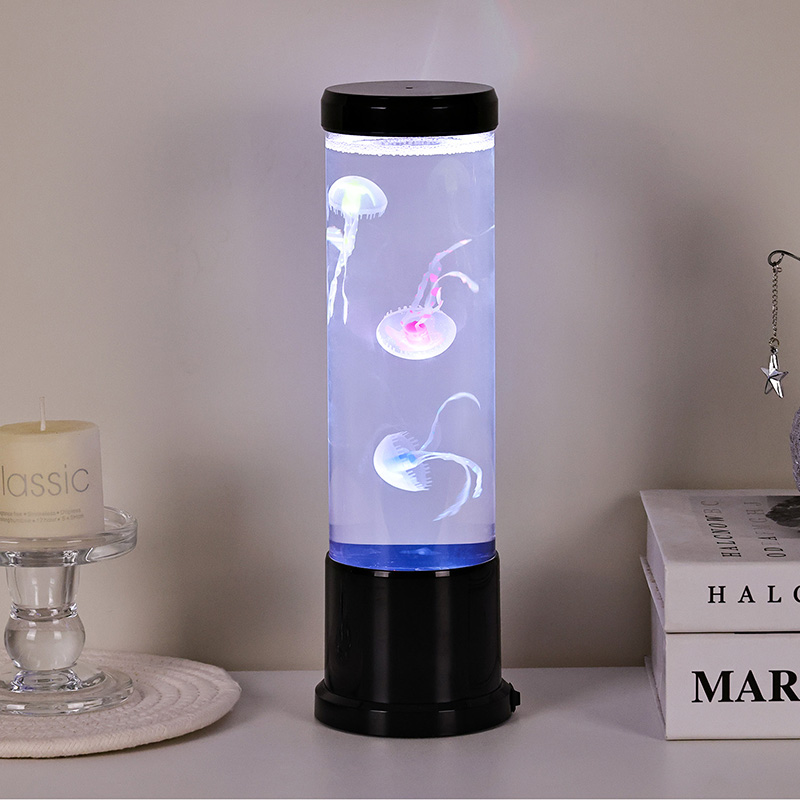 Elegancki design spotyka się z inspirowaną naturą Wysoka lampa LED z meduzą ma wysoki, smukły cylinder wykonany z wysokiej jakości przezroczystego akrylu, który zapewnia krystalicznie czystą widoczność pełnej wdzięku meduzy. Trzy realistyczne meduzy, otoczone miękkim, niebieskim płynem, delikatnie unoszą się i pulsują, a ich półprzezroczyste ciała oświetlają dynamiczne, wielokolorowe światła LED. Delikatny blask zmienia się w spektrum kojących odcieni – od głębokiego oceanicznego błękitu i fioletu po delikatne róże i zielenie – naśladując bioluminescencję występującą w prawdziwym środowisku głębinowym. Góra i podstawa lampy są wykończone błyszczącym czarnym tworzywem sztucznym, co nadaje jej nowoczesny, minimalistyczny wygląd, który uzupełnia każdy styl wystroju.