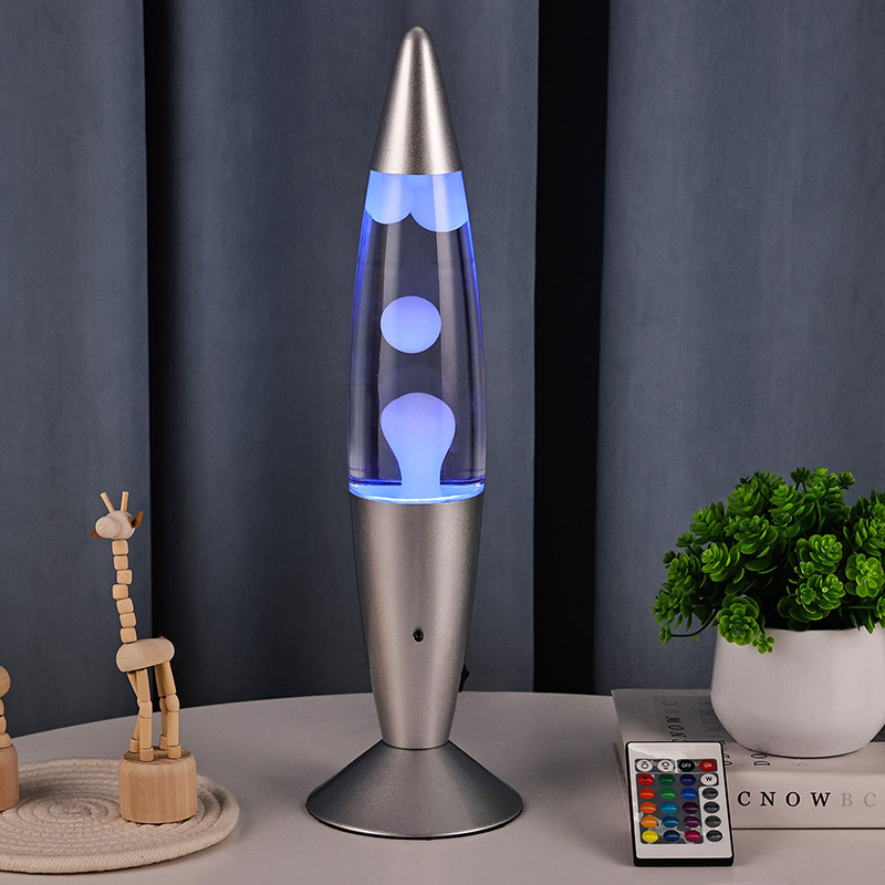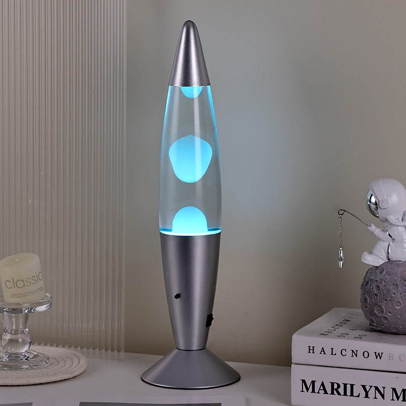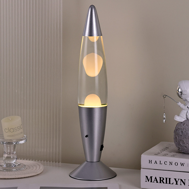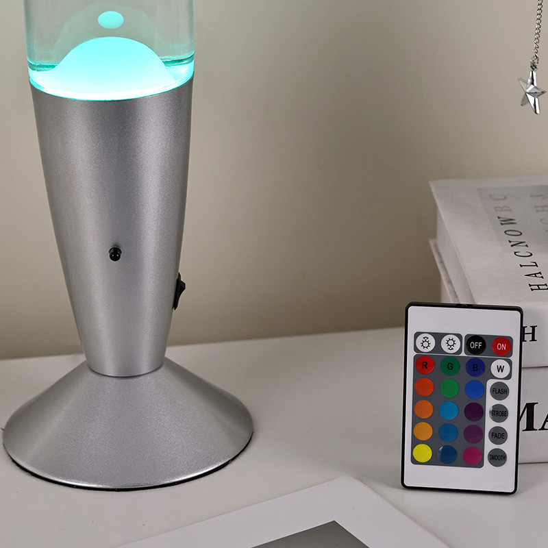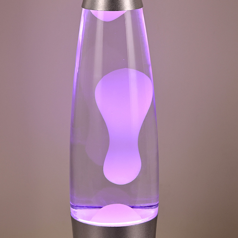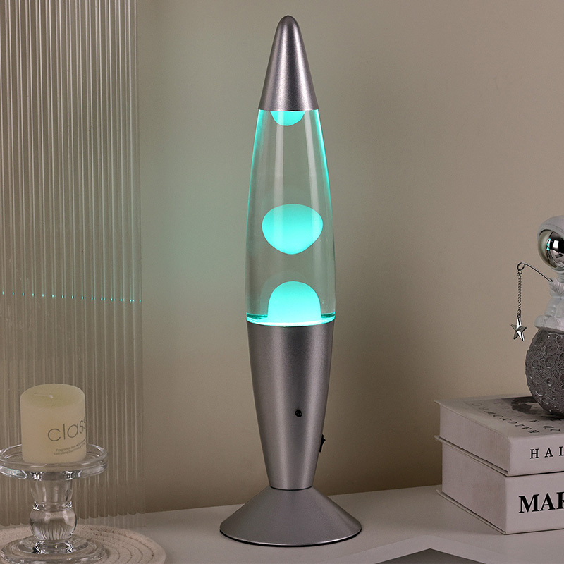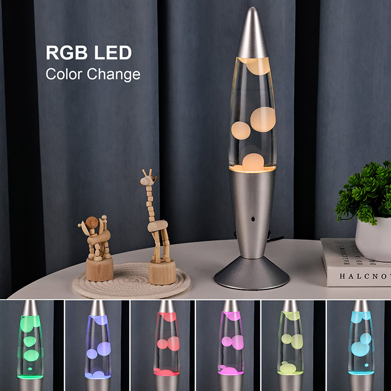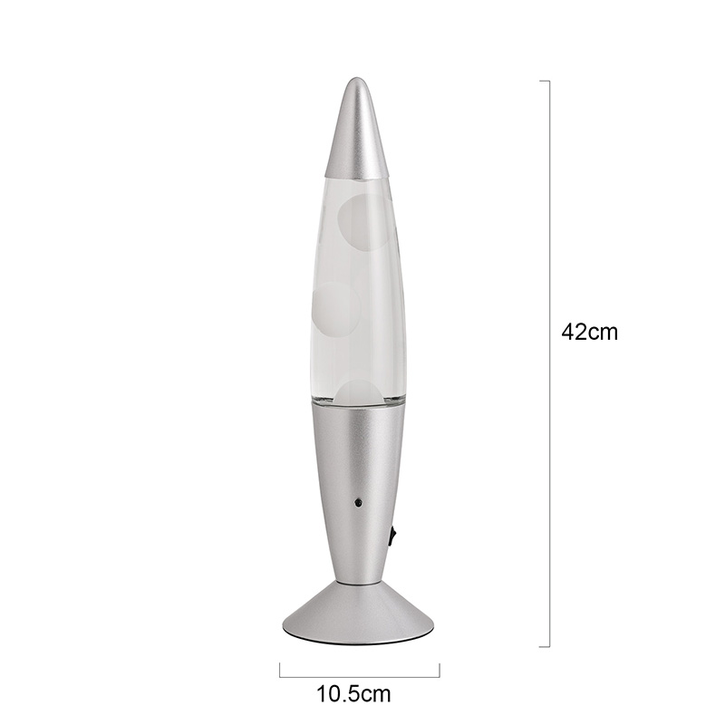 16-calowa lampa lawowa sterowana dolnym wyłącznikiem zasilania ma klasyczny kształt kuli, ze srebrną metalową obudową w połączeniu z przezroczystym szklanym korpusem butelki, jest prosta, ale stylowa. Kolorowe światła wewnątrz przechodzą przez płynący stop