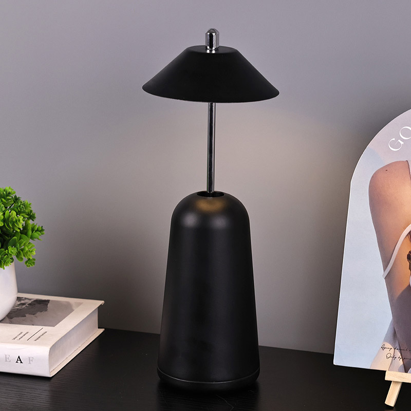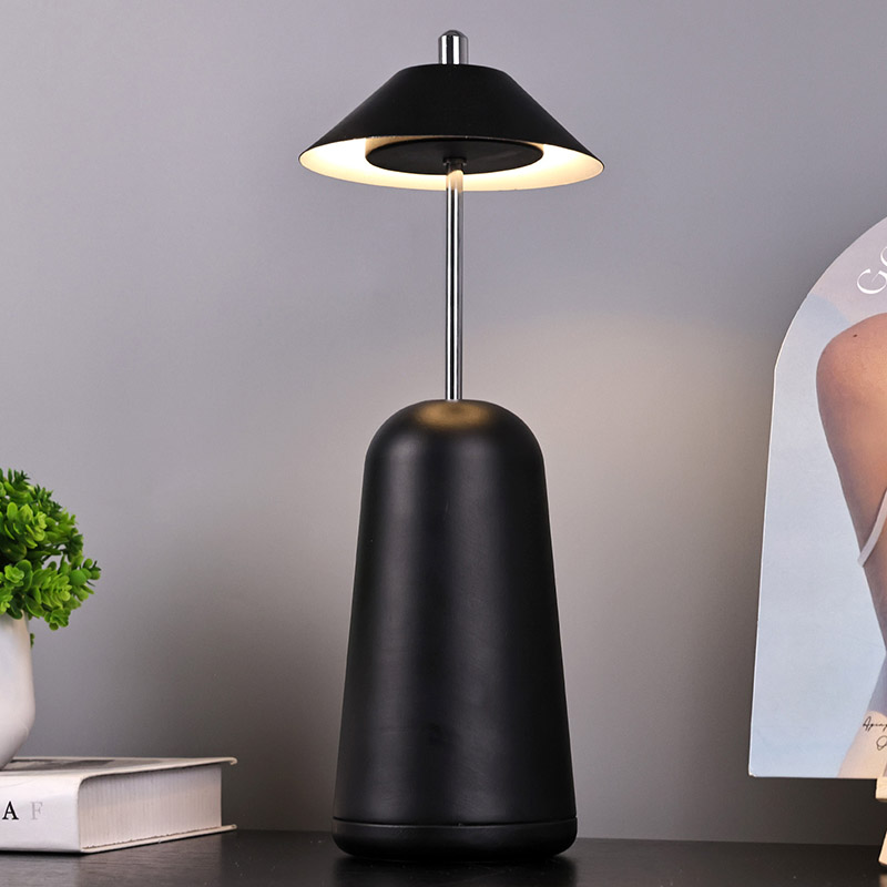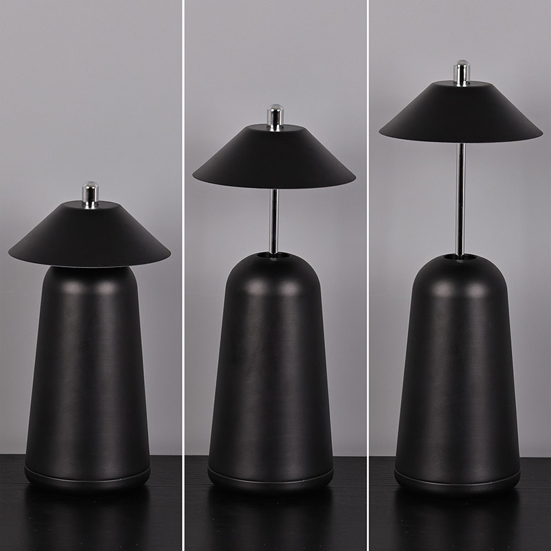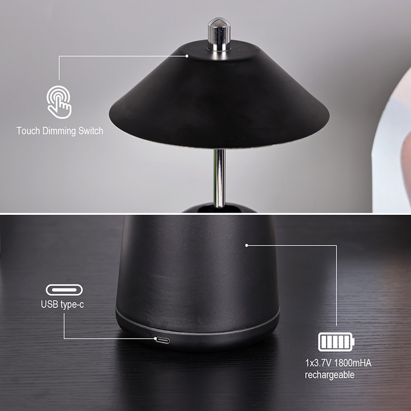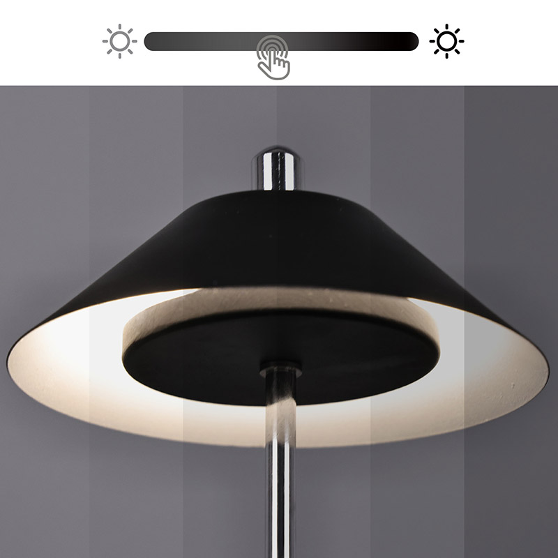 Światło nowoczesnej lampy biurkowej LED z regulacją wysokości cienia jest wcinane wewnętrznie w klosz, o ciepłych kolorach i trzech poziomach natężenia światła w zakresie od 3000 K do 6500 K. W górnej części klosza znajduje się włącznik dotykowy, przypominający antenę. Podstawa składa się z nieregularnego, cylindrycznego metalu