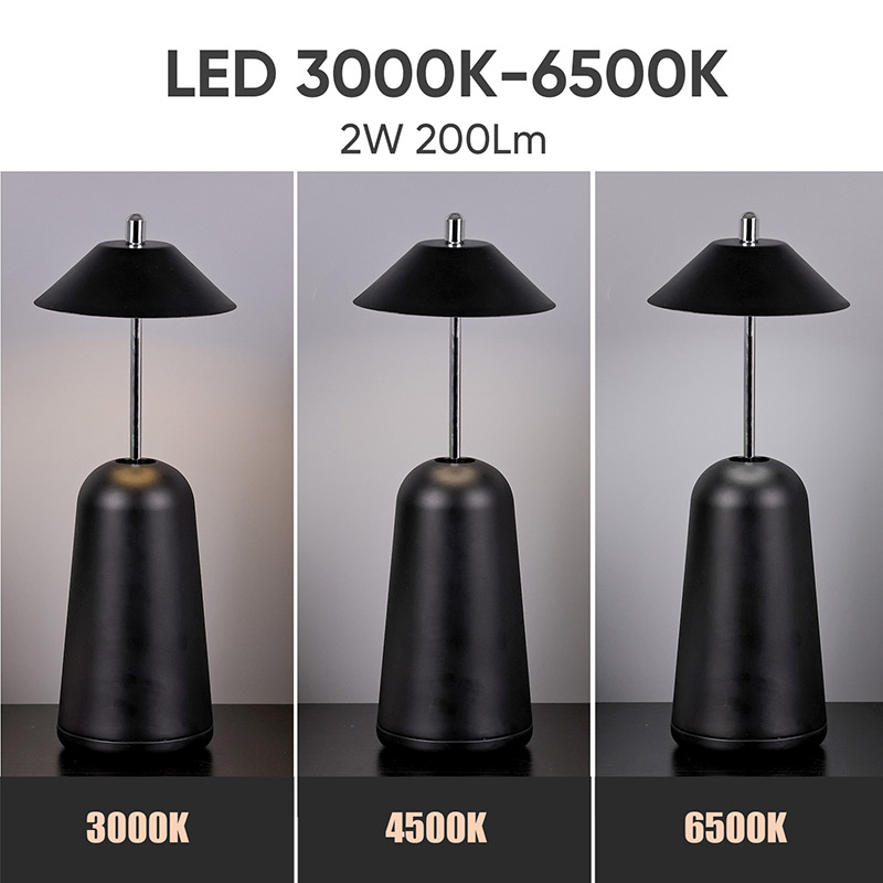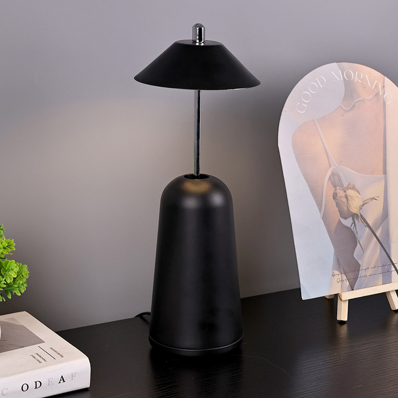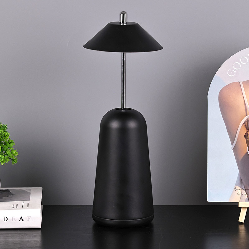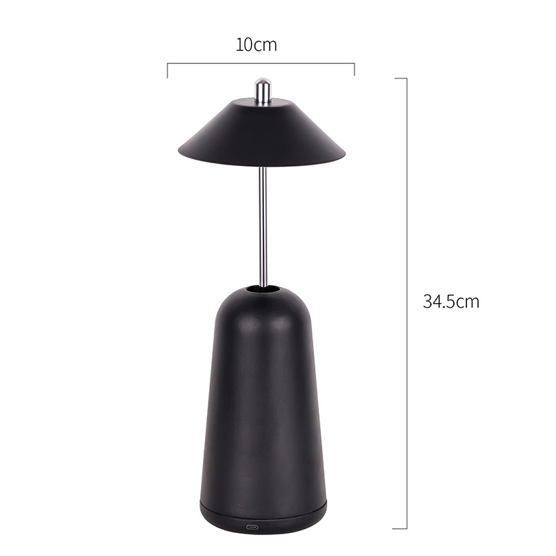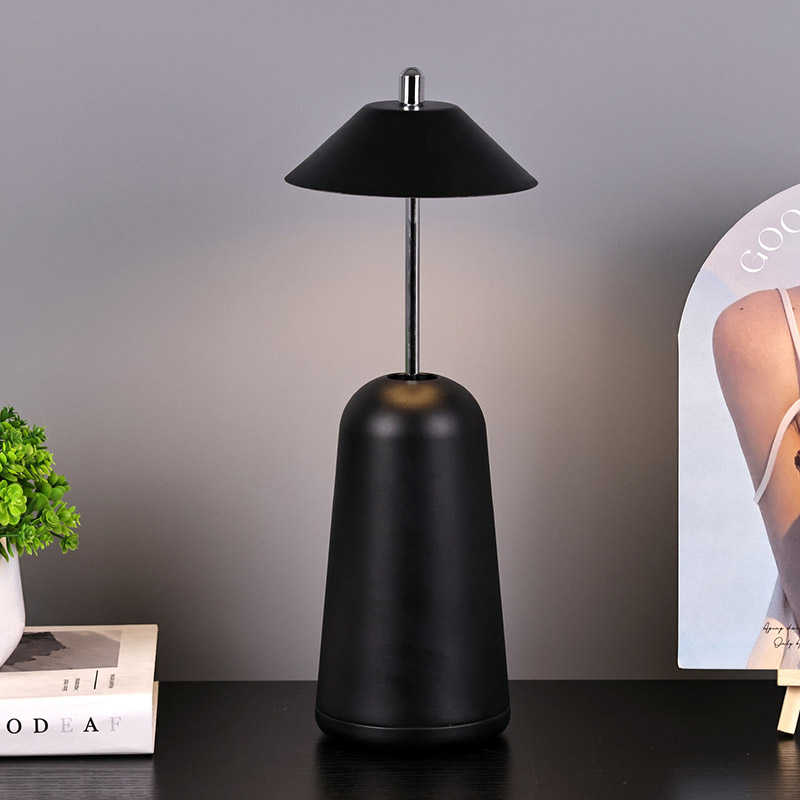 Światło nowoczesnej lampy biurkowej LED z regulacją wysokości cienia jest wcinane wewnętrznie w klosz, o ciepłych kolorach i trzech poziomach natężenia światła w zakresie od 3000 K do 6500 K. W górnej części klosza znajduje się włącznik dotykowy, przypominający antenę. Podstawa składa się z nieregularnego, cylindrycznego metalu
