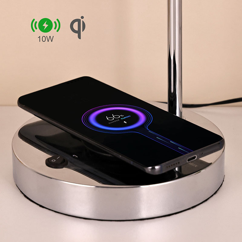 Lampka biurkowa LED QI ze szklanym kloszem posiada certyfikat QI Wireless. Bezprzewodowa ładowarka do telefonu 5V1A na podstawie