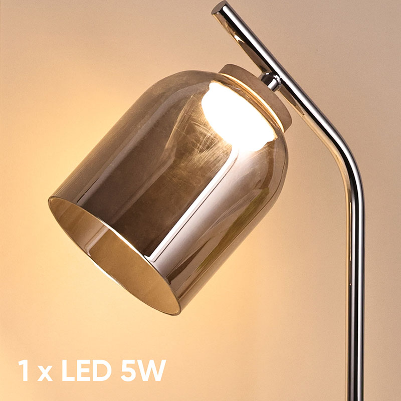 Podstawa chromowana, klosz ze szkła dymnego (bursztynowego).Innowacyjny projekt, szklany materiał, wysokiej klasy i elegancki wygląd, bardzo ozdobny styl lampy biurkowej
