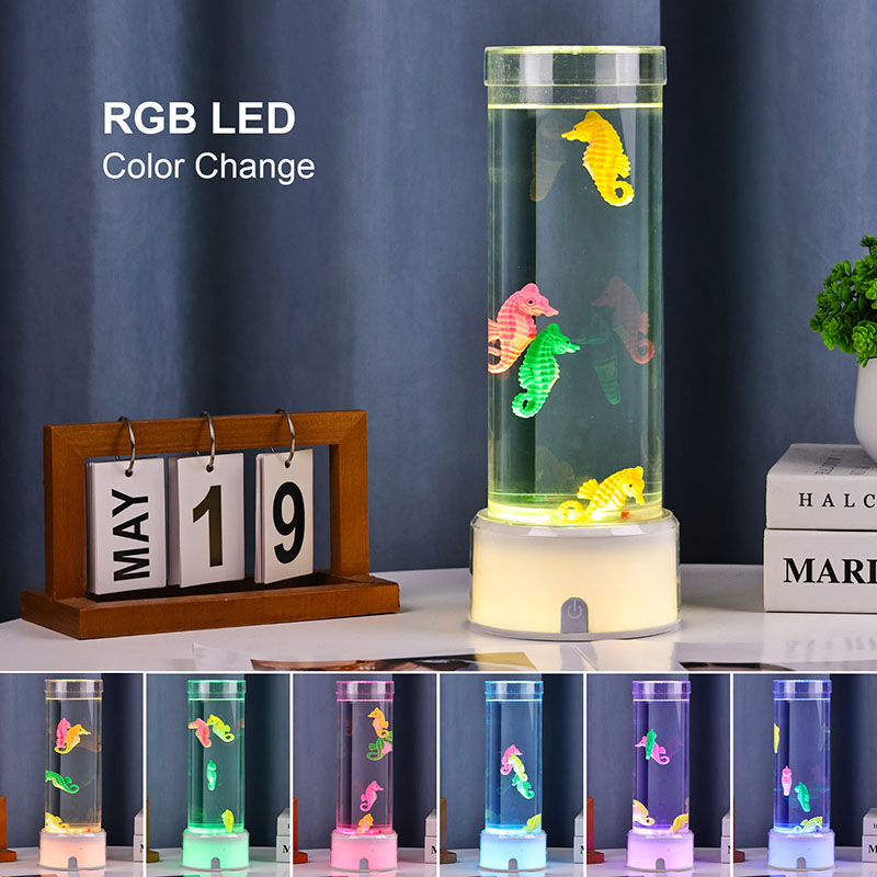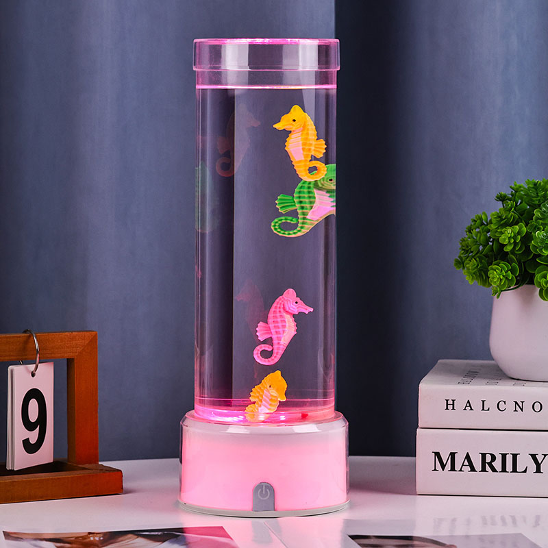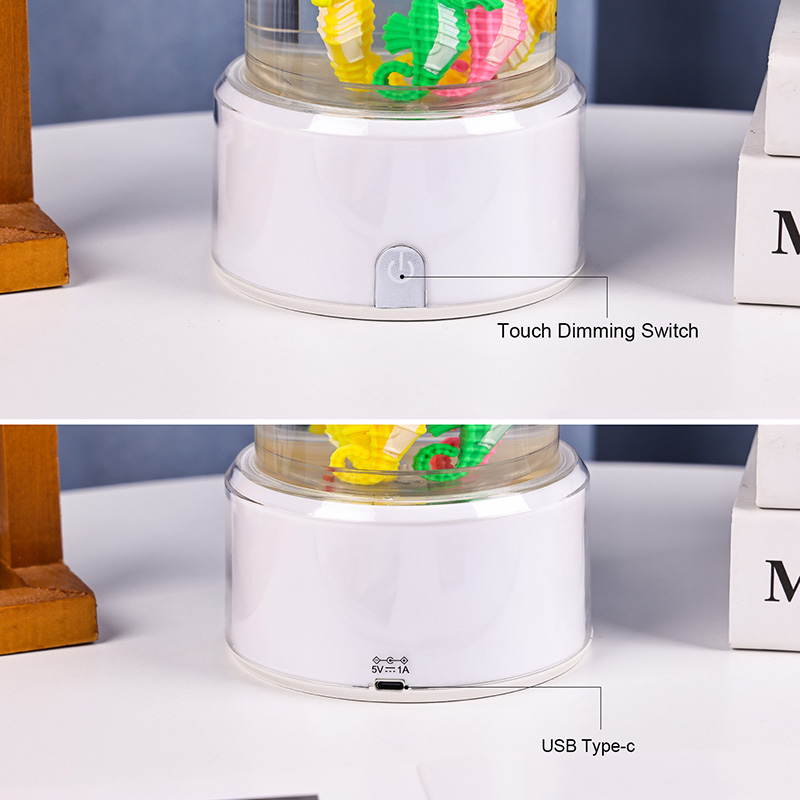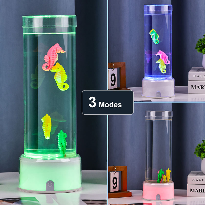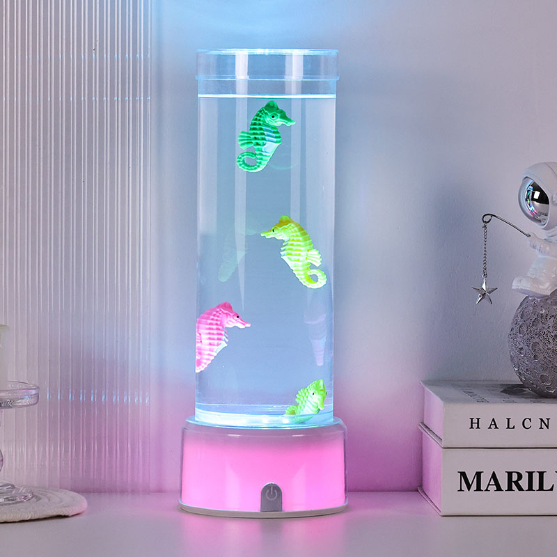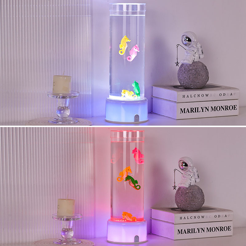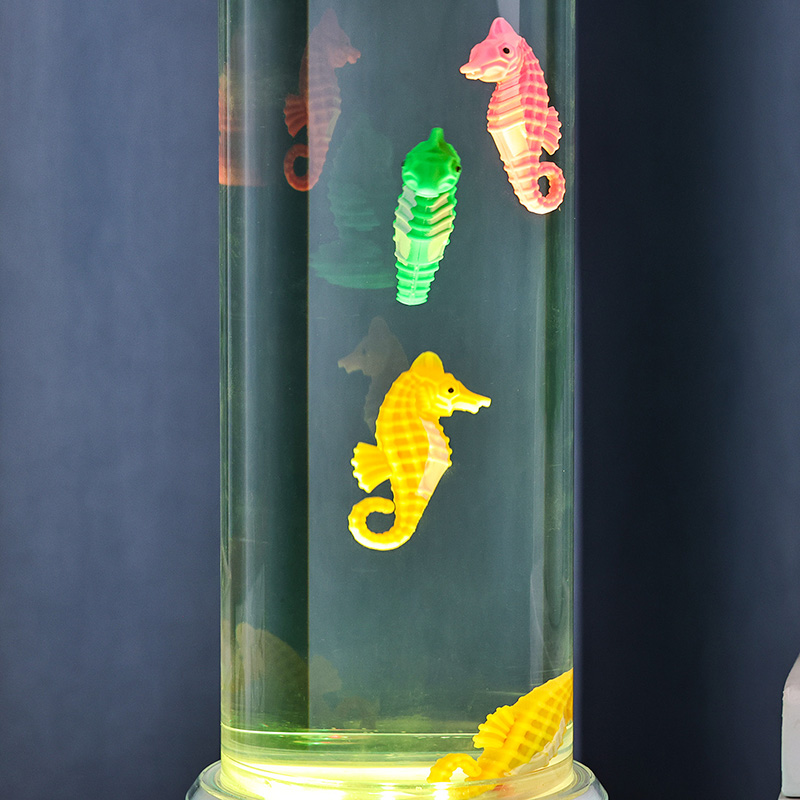 hipnotyzująca podwodna scena, która przywołuje na myśl spokój oceanu Całe urządzenie wykonane jest z wysokiej jakości trwałego tworzywa sztucznego zapewniającego bezpieczeństwo, stabilność i długotrwałą wydajność Lampa ma około 12 cali wysokości i elegancką przezroczystą rurkę wypełnioną nietoksycznym płynem i kolorowymi ozdobami w kształcie konika morskiego Każdy konik morski jest starannie wykonany z dbałością o szczegóły, charakteryzuje się żywymi kolorami i realistycznymi teksturami Pływa z wdziękiem w kolumnie cieczy zasilany cichym wewnętrznym systemem cyrkulacji, który tworzy naturalny ruch kołysający przypominający prawdziwe życie morskie Ten delikatny ruch działa kojąco na oglądanie i pomaga zmniejszyć stres, zapewniając jednocześnie uspokajające wrażenia wizualne
