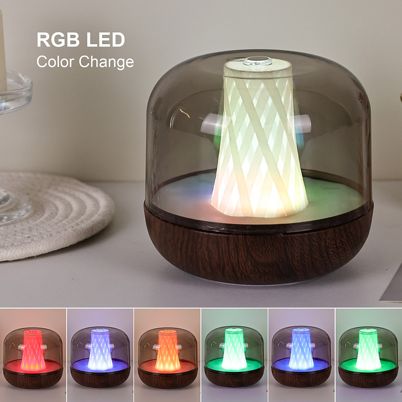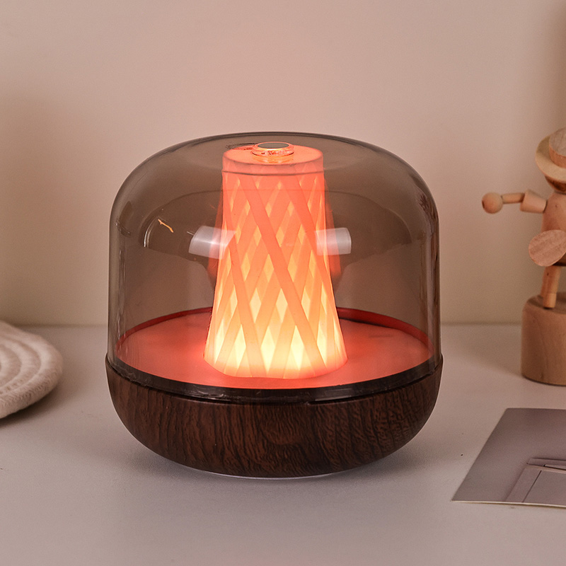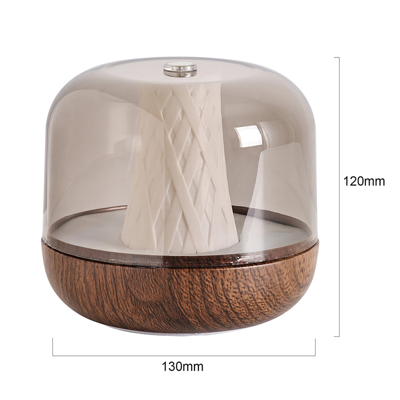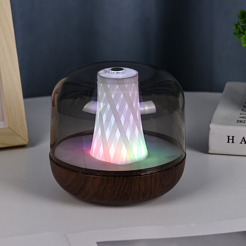 Gdy światło tańczy w wieży, przezroczysta plastikowa osłona delikatnie rozprasza blask, tworząc mglistą, eteryczną atmosferę. W zaciemnionym pomieszczeniu cała konstrukcja wygląda jak unosząca się w powietrzu „Wieża Światła” – promieniująca spokojem i tajemnicą, zachęcająca do cichej kontemplacji.