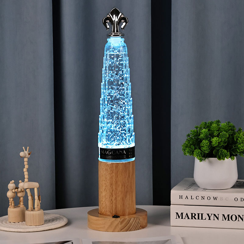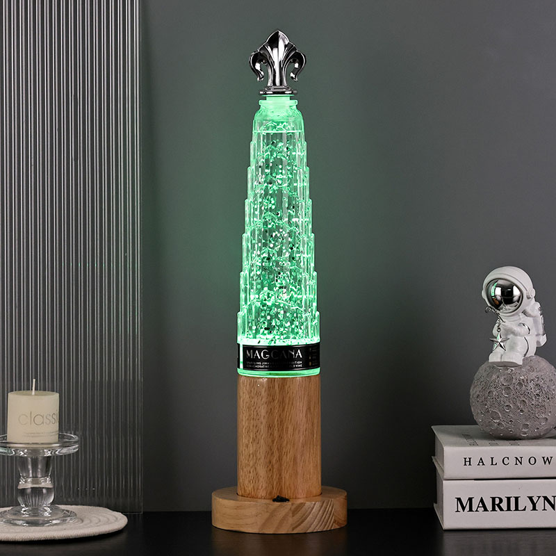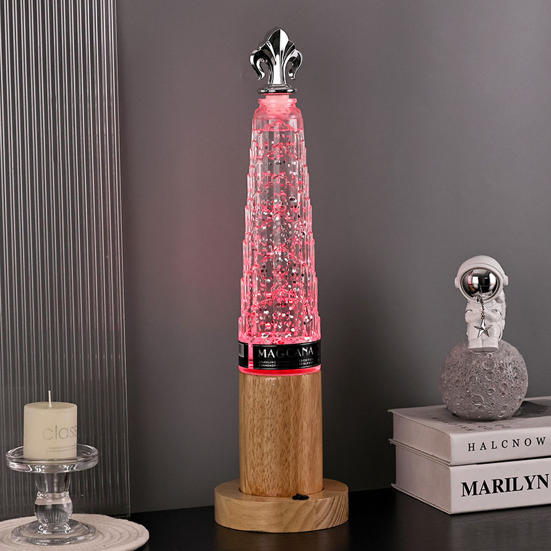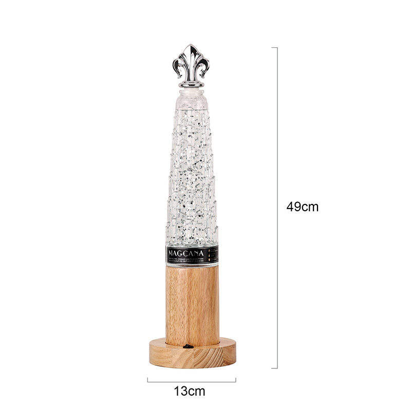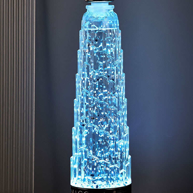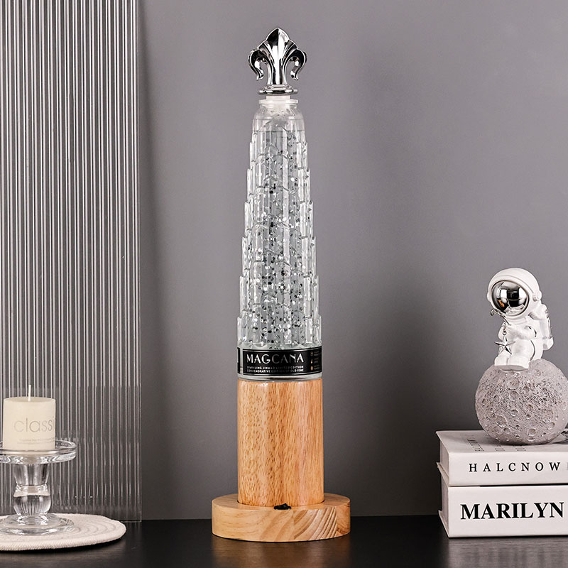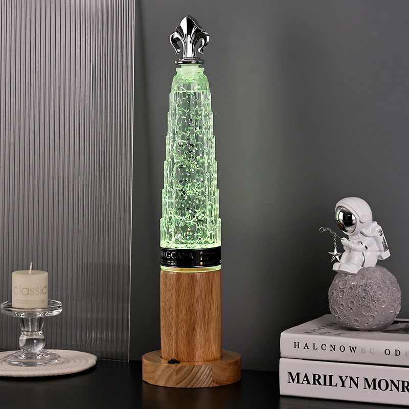 Lampa stołowa z błyszczącym kloszem w kształcie wieży ma klasyczny wygląd w kształcie wieży, z wykwintnymi metalowymi dekoracjami osadzonymi na górze, prostymi, ale szlachetnymi. Przezroczysta szklana butelka zawiera płyn i