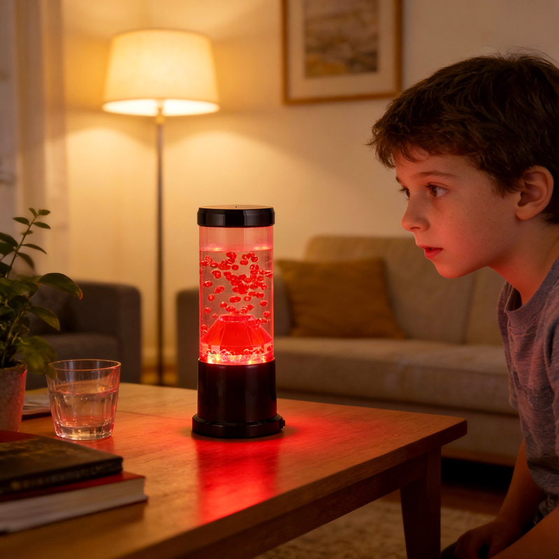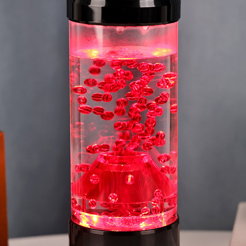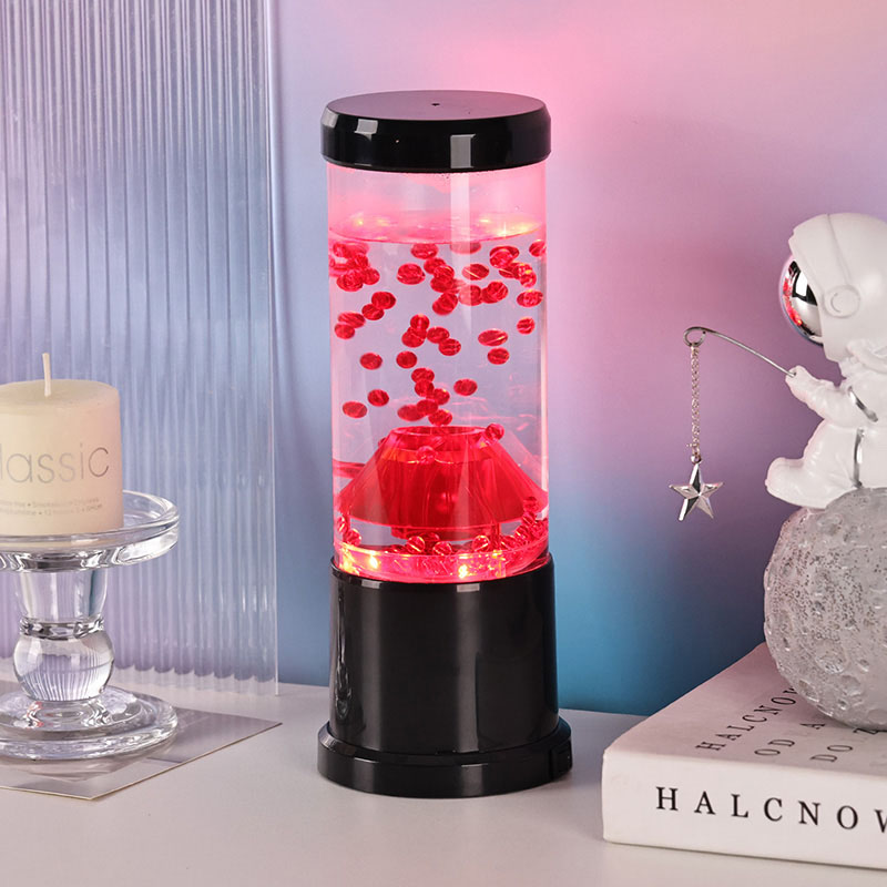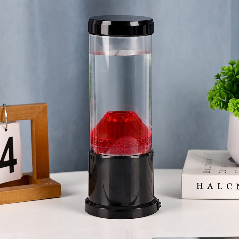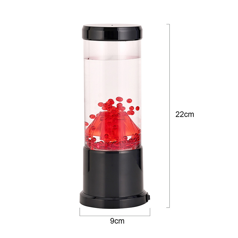 Centralnym elementem lampki nocnej jest przezroczysta kolumna przypominająca krater wulkanu. Wewnątrz tej kolumny znajdziesz żywy pokaz czerwonych kul, przypominających stopioną lawę przepływającą przez skorupę ziemską. Kule te unoszą się z wdziękiem w przezroczystej cieczy, tworząc dynamiczny i ciągle zmieniający się efekt wizualny. Gdy światło prześwieca, rzuca ciepły i zachęcający blask, idealny do stworzenia przytulnej atmosfery w każdym pomieszczeniu.